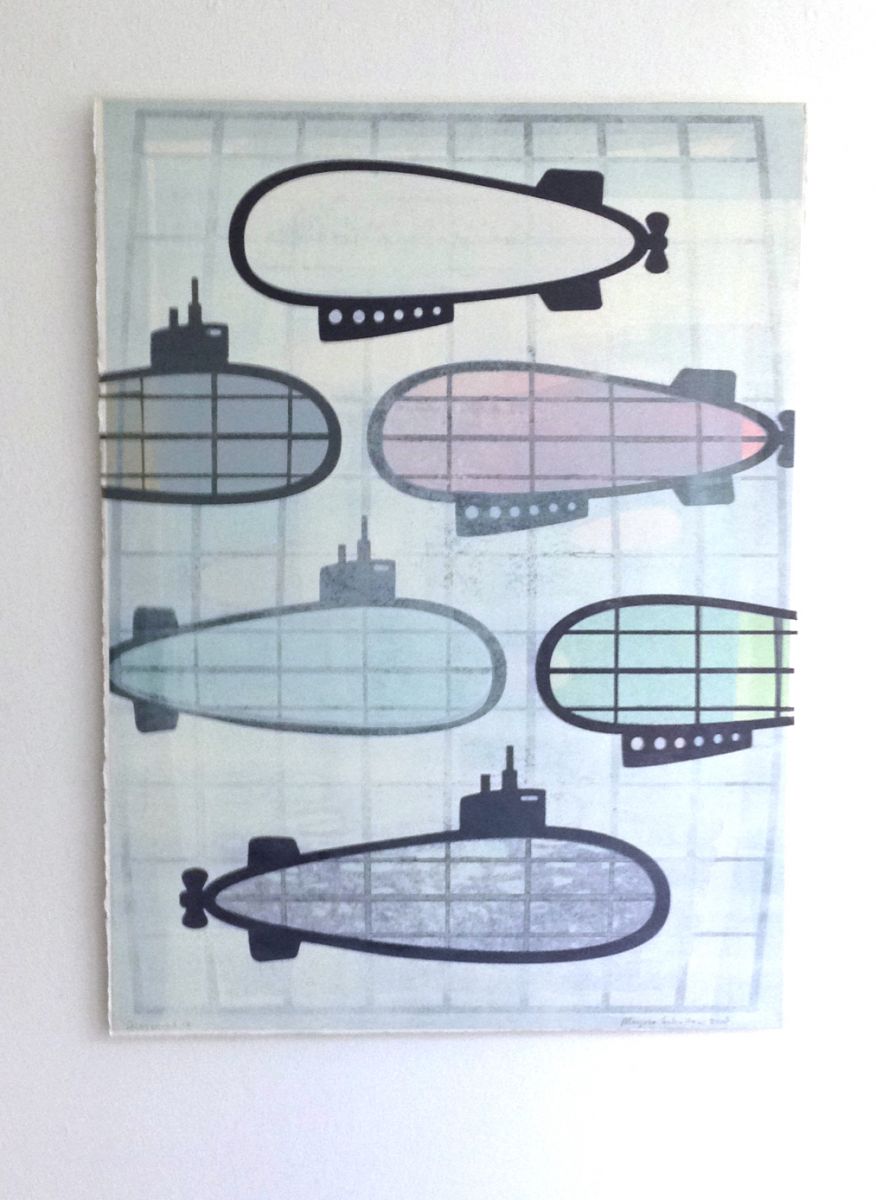 De archetypische vorm en het industriële lijnenspel van de constructie van de onderzeeboten en de luchtschepen fascineren mij mateloos. In mijn werk wordt deze vorm gespiegeld, verkleind, verdraaid, vervormd. Het beeld wordt met de jaren steeds abstracter en komt zelfs letterlijk los van het papier. Als wandobjecten lijken de luchtschepen klaar om weg te zweven.